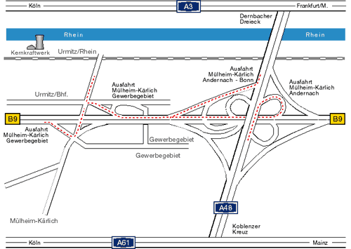 Urmitz am Rhein liegt linksrheinisch zwischen Koblenz und Andernach und ist über die Bundesstraße 9 über die Abfahrt Mülheim-Kärlich, Richtung Kernkraftwerk zu erreichen. Sie gelangen